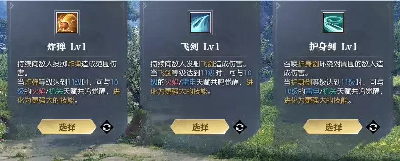 开局时,玩家可以从三个初始技能中做出选择。通过击杀怪物获取经验提升等级,每次升级都能强化已选取的技能,并赋予其强力的特殊效果。