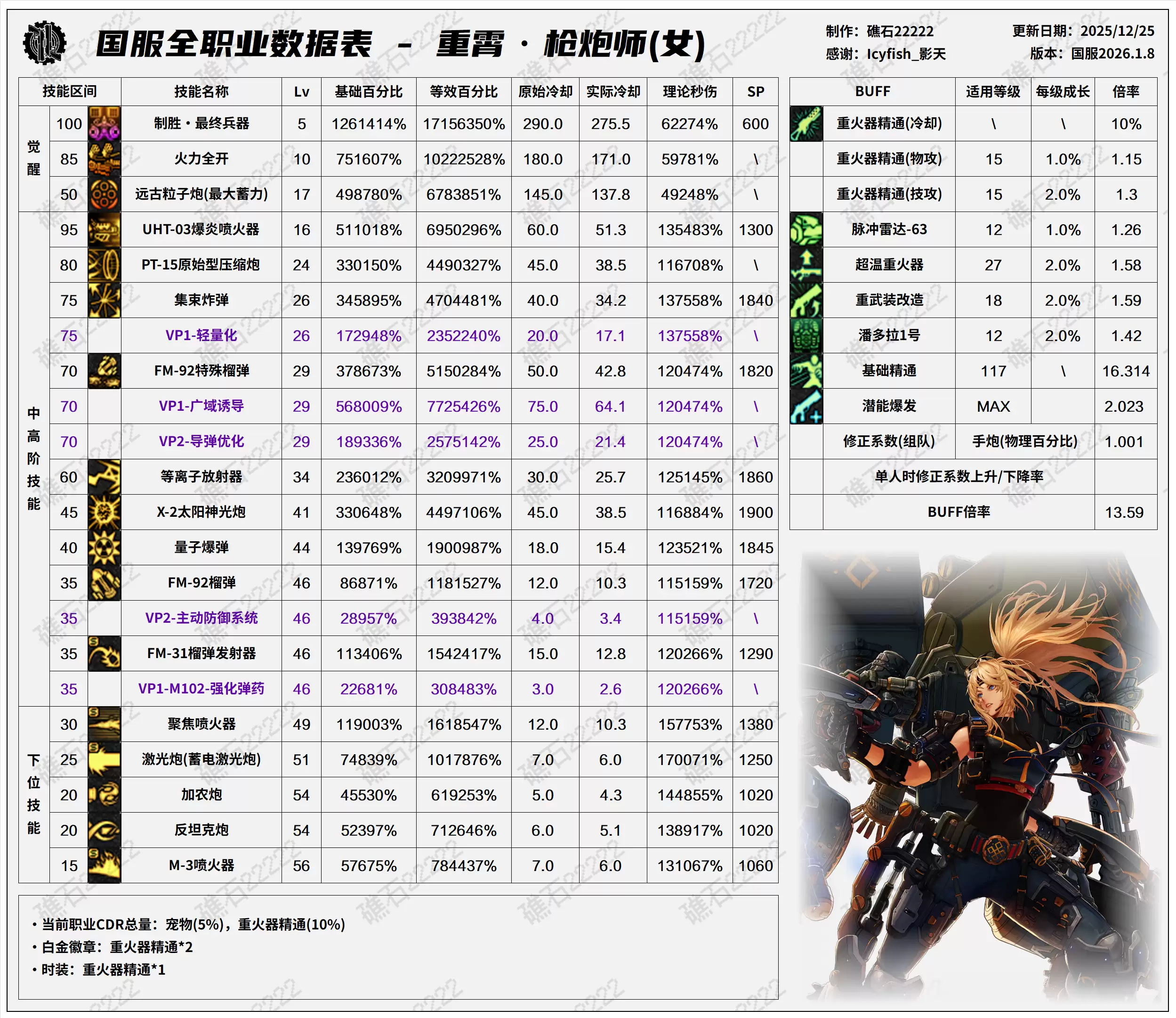 各位勇士,大家好。本期我们将深入分析《地下城与勇士》千海天版本中,女枪炮师(女大枪)的核心技能数据与实战表现。这份详尽的技能数据一览,旨在为你的技能加点、输出循环构建以及装备搭配提供关键的数据支撑与优化思路。