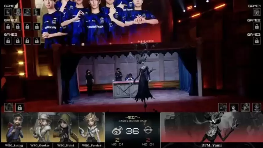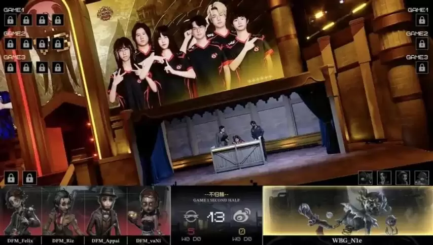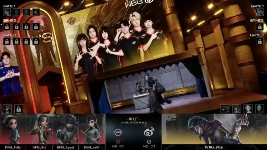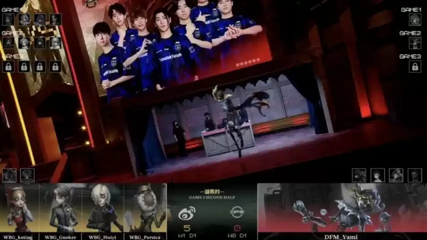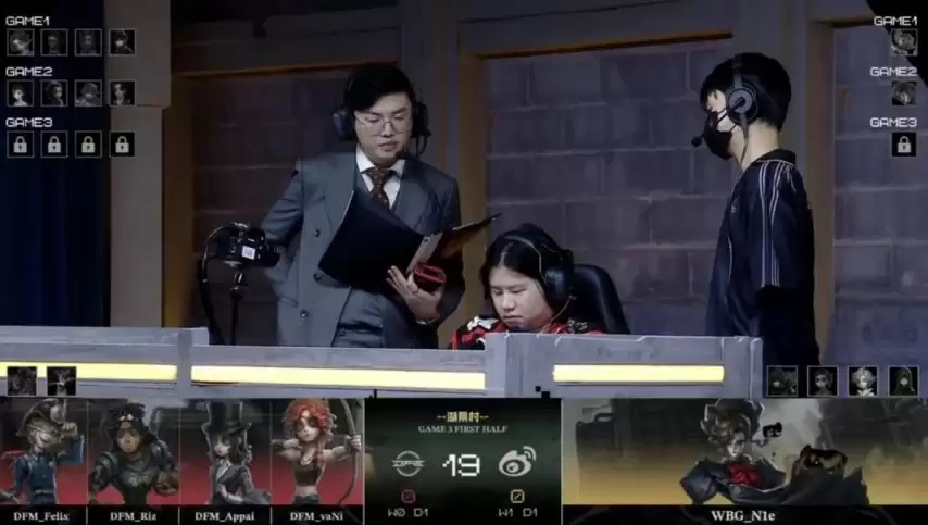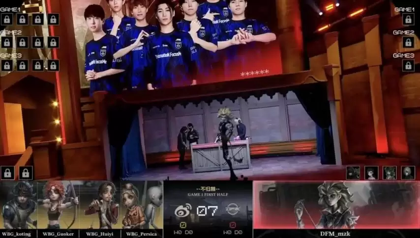 来到关键的第三局,DFM求生者派出了火灾调查员、前锋、幻灯师和弓箭手(BAN掉了“跛脚羊”和时空之影);北京WBG的监管者N1e再次登场,选出歌剧演员。(BAN位针对了先知、空军、气象学家和佣兵)