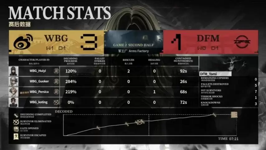 下半轮,北京WBG的求生者选择了冒险家、气象学家、佣兵和“法罗女士”(BAN掉了“跛脚羊”);DFM的监管者Yami拿出了时空之影。(BAN位给到先知、古董商、火灾调查员和杂技演员)
