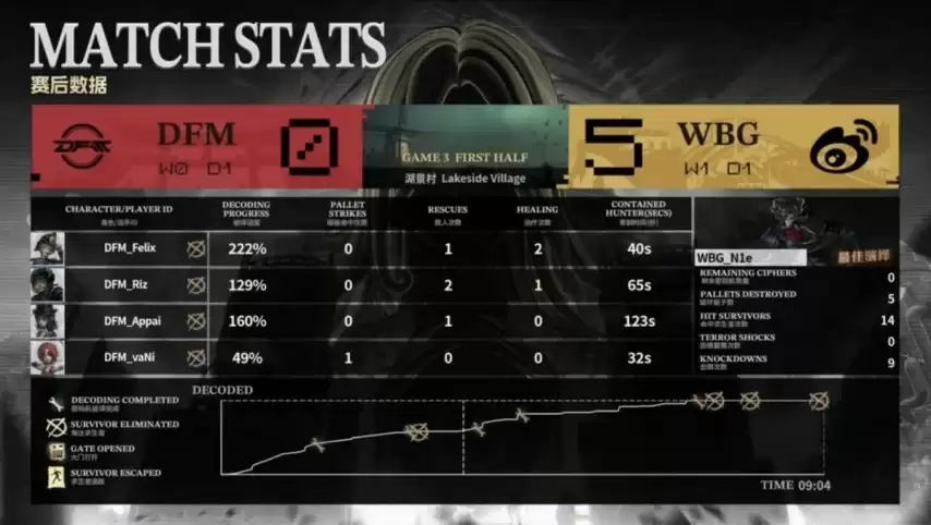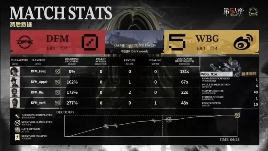 第二局,DFM求生者阵营调整为古董商、医生、飞行家和大副(BAN掉了时空之影);北京WBG的监管者N1e则选出杂货商。(BAN位是先知、幻灯师、气象学家和守墓人)
