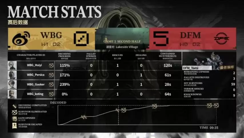 最后一轮,北京WBG求生者阵容为玩具商、入殓师、守墓人和昆虫学者(BAN掉了“跛脚羊”和歌剧演员);DFM监管者Yami则选出“喧嚣”背水一战。(BAN位是先知、古董商、火灾调查员和咒术师)