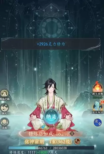 游戏初期,修为获取始于最基础的“纳灵”操作。玩家只需在主界面点击即可完成一次修炼,稳定获得100点修为,帮助新手快速熟悉流程。当你成功踏入炼气初期后,游戏的核心“放置”机制——挂机修炼便会自动开启。这意味着即使离线,角色也会持续积累修为,为你的基础成长提供稳定保障。这套机制贯穿游戏前中期,是修为积累的基石。