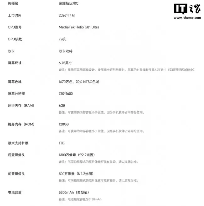 荣耀畅玩 70C 手机上架:联发科 Helio G81 Ultra 可选 4/6GB RAM 799 元起