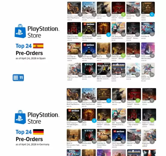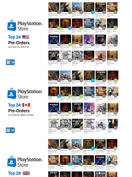 热度这东西,数据不会说谎。《刺客信条:黑旗 记忆重置》的期待值,从各地PS商店的预购情况就能看得一清二楚。在统计的九大主流区域里,它足足占据了八个地区的预购冠军宝座。这份成绩单,无疑为这款经典重制作品积累了相当扎实的粉丝基础和市场声量。