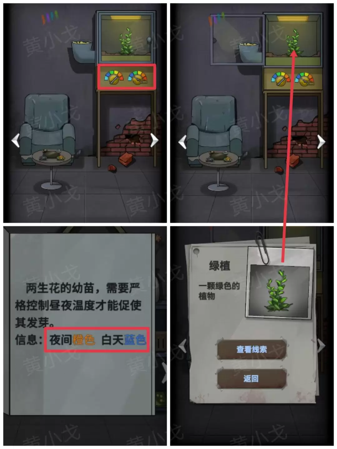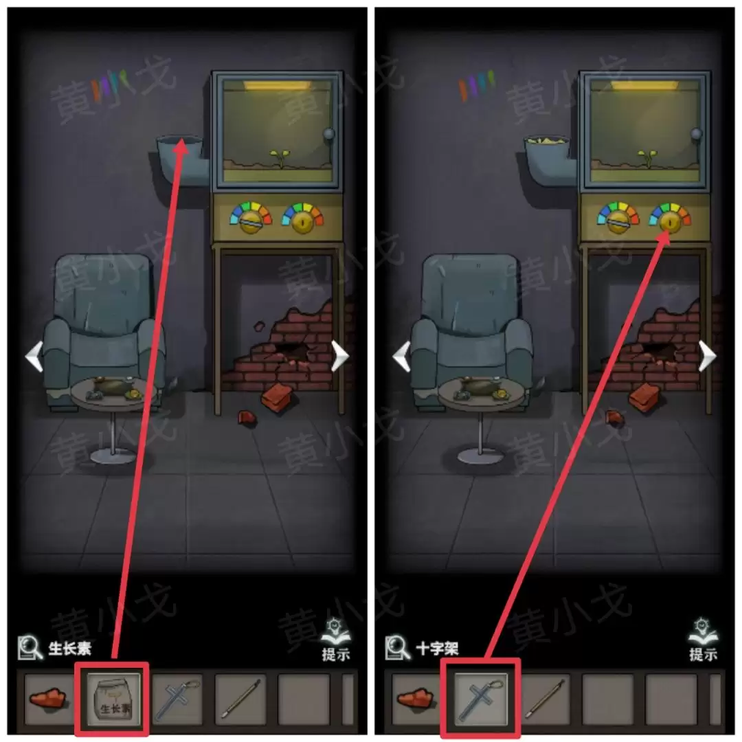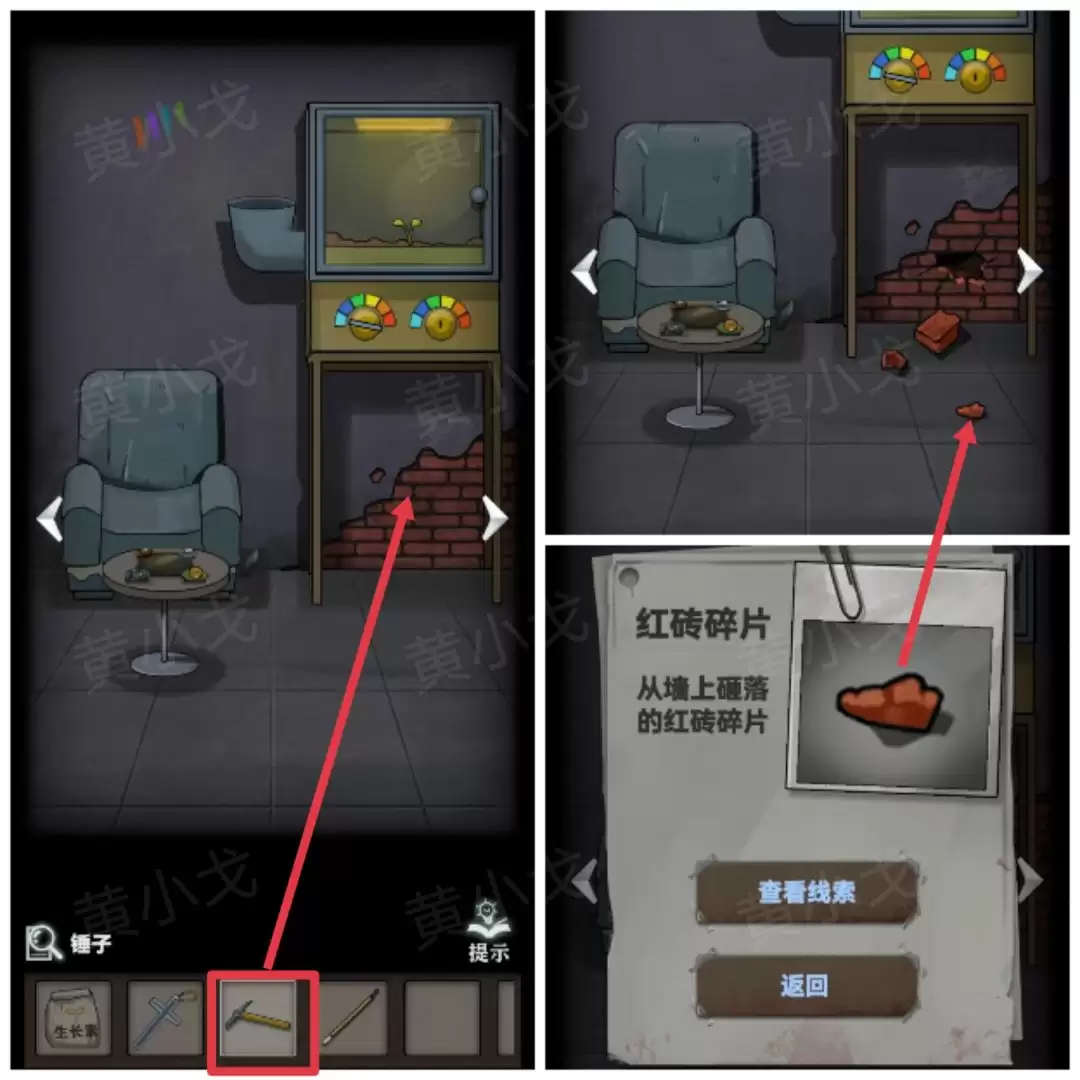 带上生长素回到恒温箱处。先用【锤子】敲开那块已经剥落的红砖墙,得到一块【红砖碎片】。