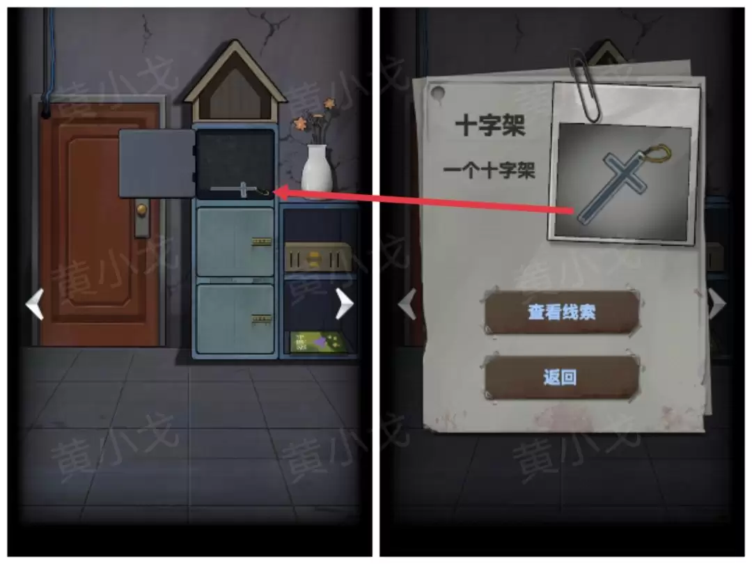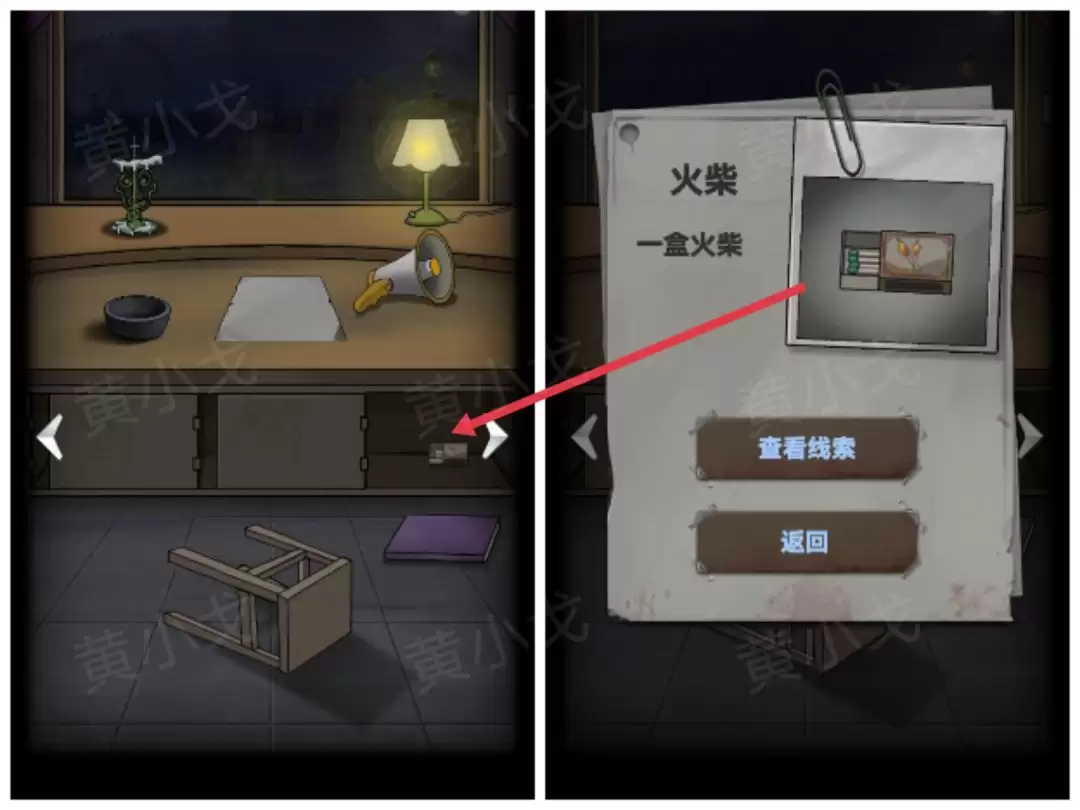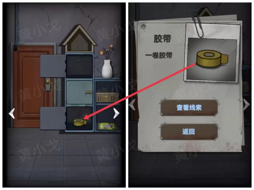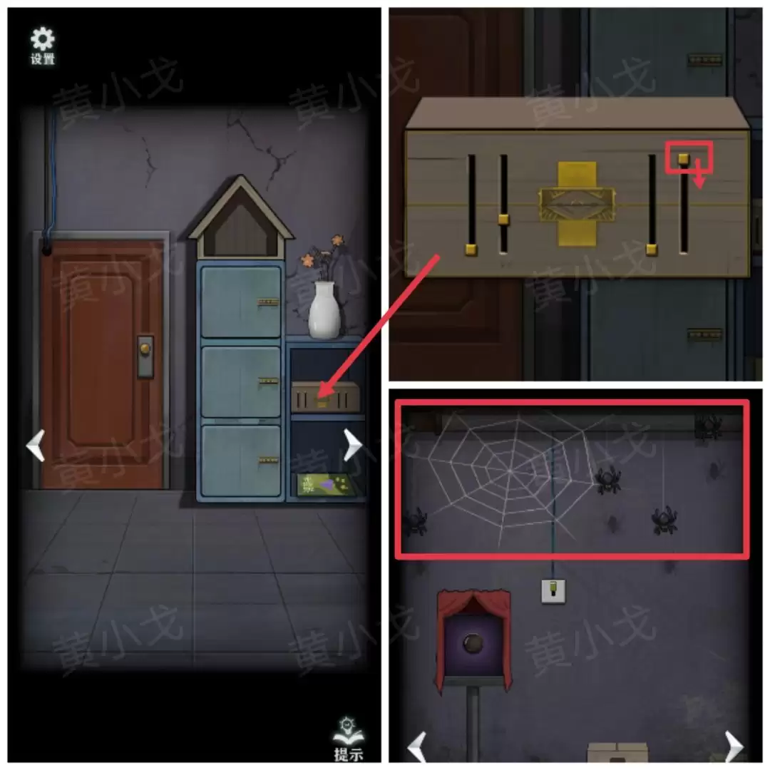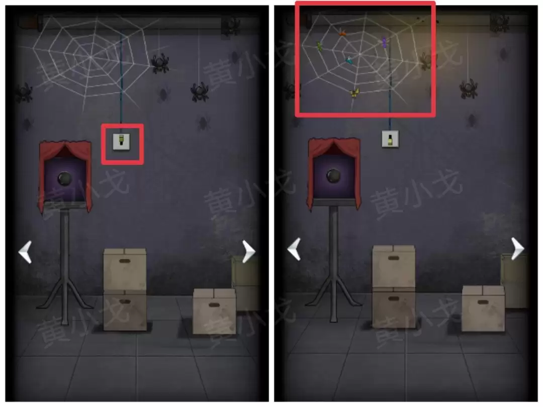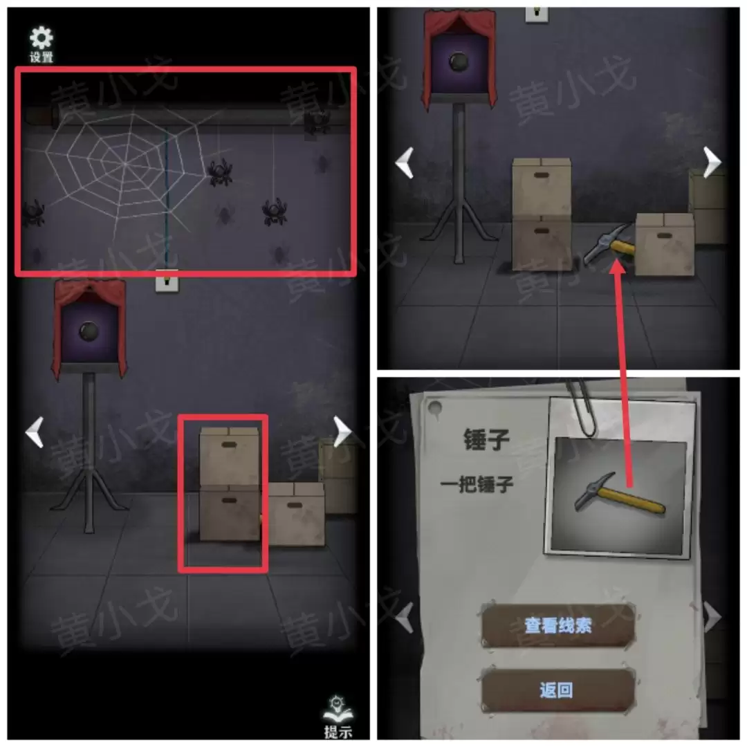 移步到相机场景。先把碍事的纸盒移开,下面藏着一把【锤子】。另外,墙上蜘蛛停留的位置很特别,最好用脑子或者截图记下来。