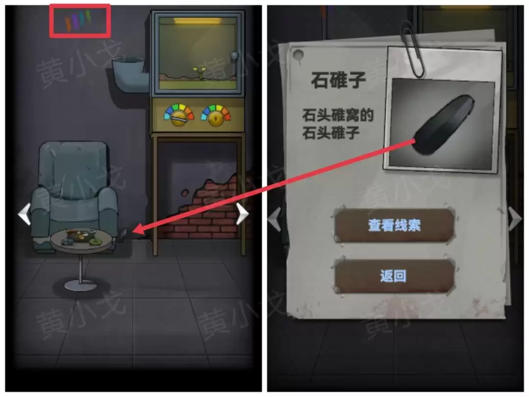 现在,转向恒温箱所在的区域。沙发旁边有个【石碓子】,顺手捡起来。同时,注意观察墙上的涂鸦,记住它的颜色顺序:红、紫、蓝、绿。
