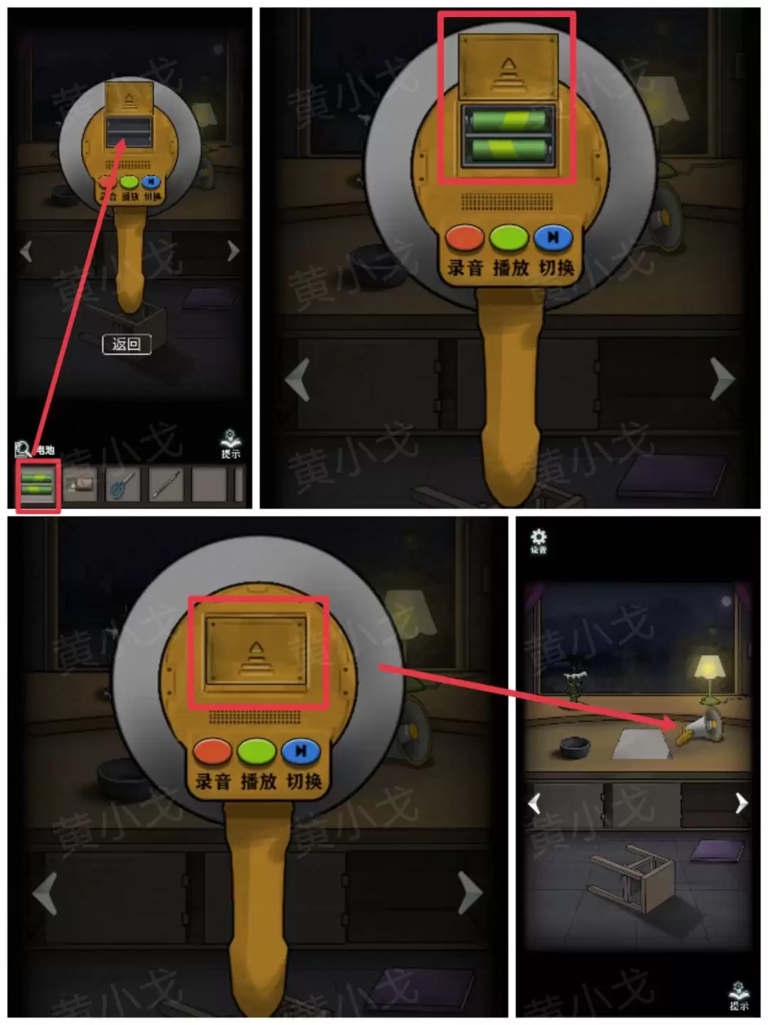 看到桌上的老式喇叭了吗?点击它,打开电池盖,把之前找到的【电池】装进去,再盖上盖子。这样一来,喇叭就能工作了。