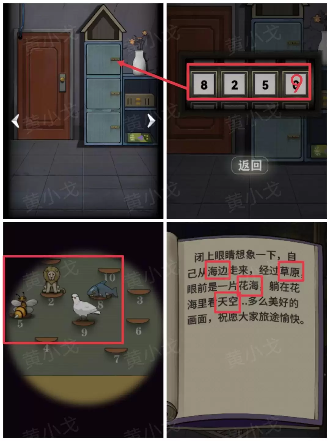 现在,注意力放到储物柜上层的密码锁。这里需要综合两条线索:一是窗户边旅行手册上的景象顺序(海边、草原、花海、天空),二是相机里看到的玩偶对应数字(蜜蜂-5、狮子-2、鸽子-9、鱼-8)。结合之前玩偶部件与景象的对应关系(草原-狮子、天空-鸽子、大海-鱼、花海-蜜蜂),按景象顺序推导出密码:8(海/鱼), 2(草原/狮子), 5(花海/蜜蜂), 9(天空/鸽子)。输入密码【8259】。
