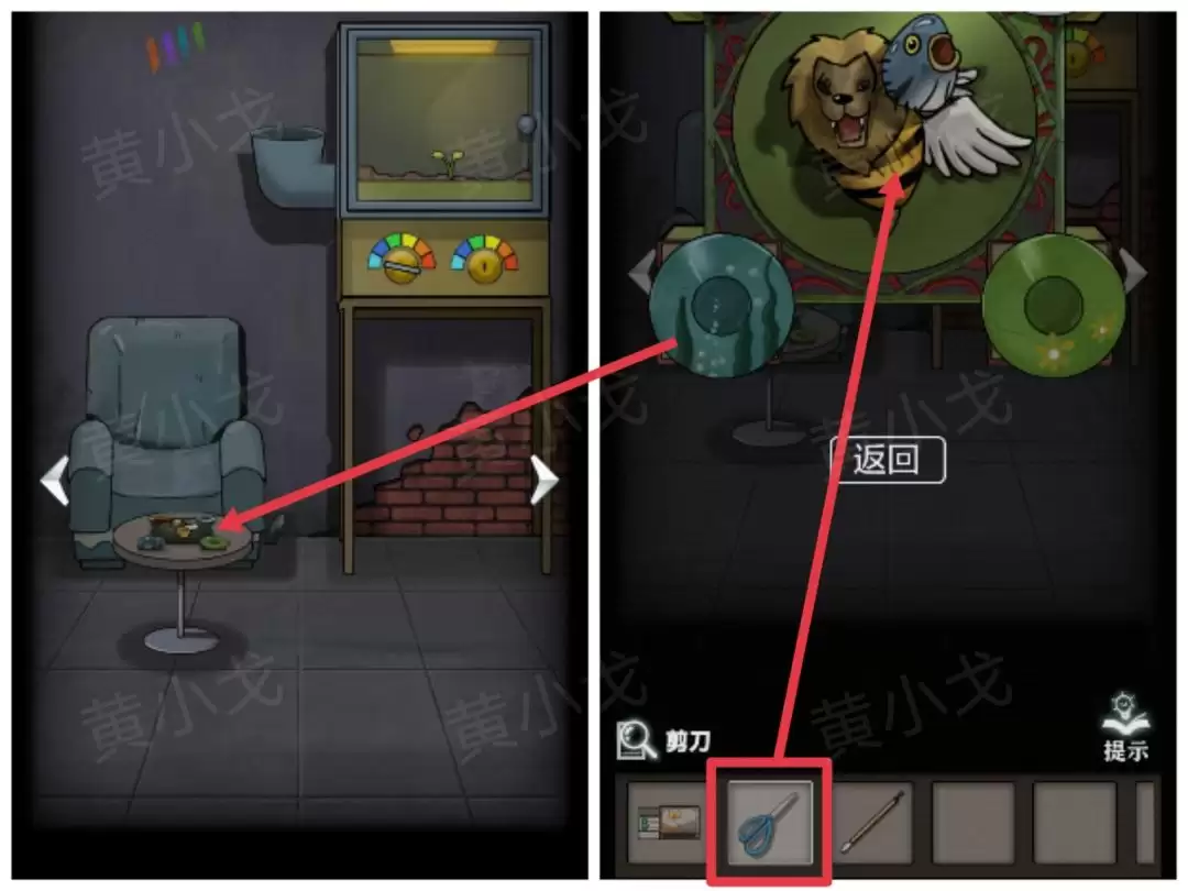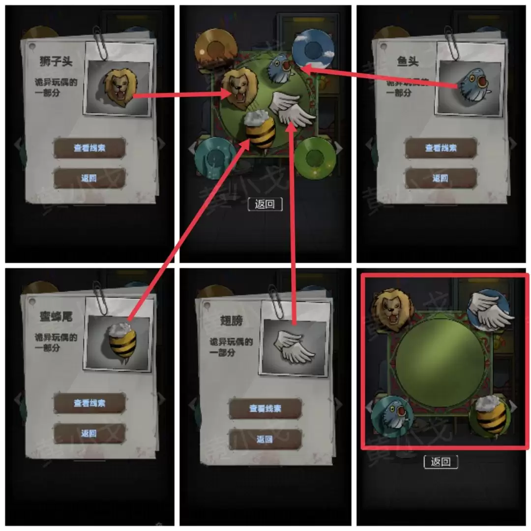 拆开后,你会得到四个部件:【狮子头】、【鱼头】、【蜜蜂尾】和【翅膀】。关键步骤来了:房间里有四个印着不同景象的圆盘,你需要把这四个部件放到对应的圆盘上。对应关系是:草原放狮子头、天空放翅膀、大海放鱼头、花海放蜜蜂尾。