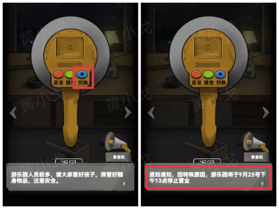 按下播放键,仔细听录音。里面提到一个关键信息:“游乐园于9月25日下午13点停止营业”。别忘了,点击切换按钮还能听到另一段音频,都留意一下。