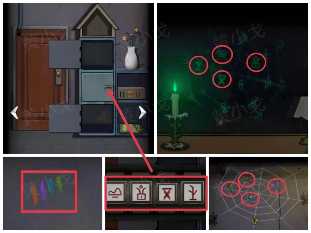 现在,来处理储物柜中间那个最后的密码锁。这个机关需要整合三条线索:恒温箱场景墙上的涂鸦颜色顺序(红紫蓝绿)、窗户上浮现的符文位置、以及相机场景里蚊虫的颜色和位置。根据这些信息,调整密码锁上的色块位置。