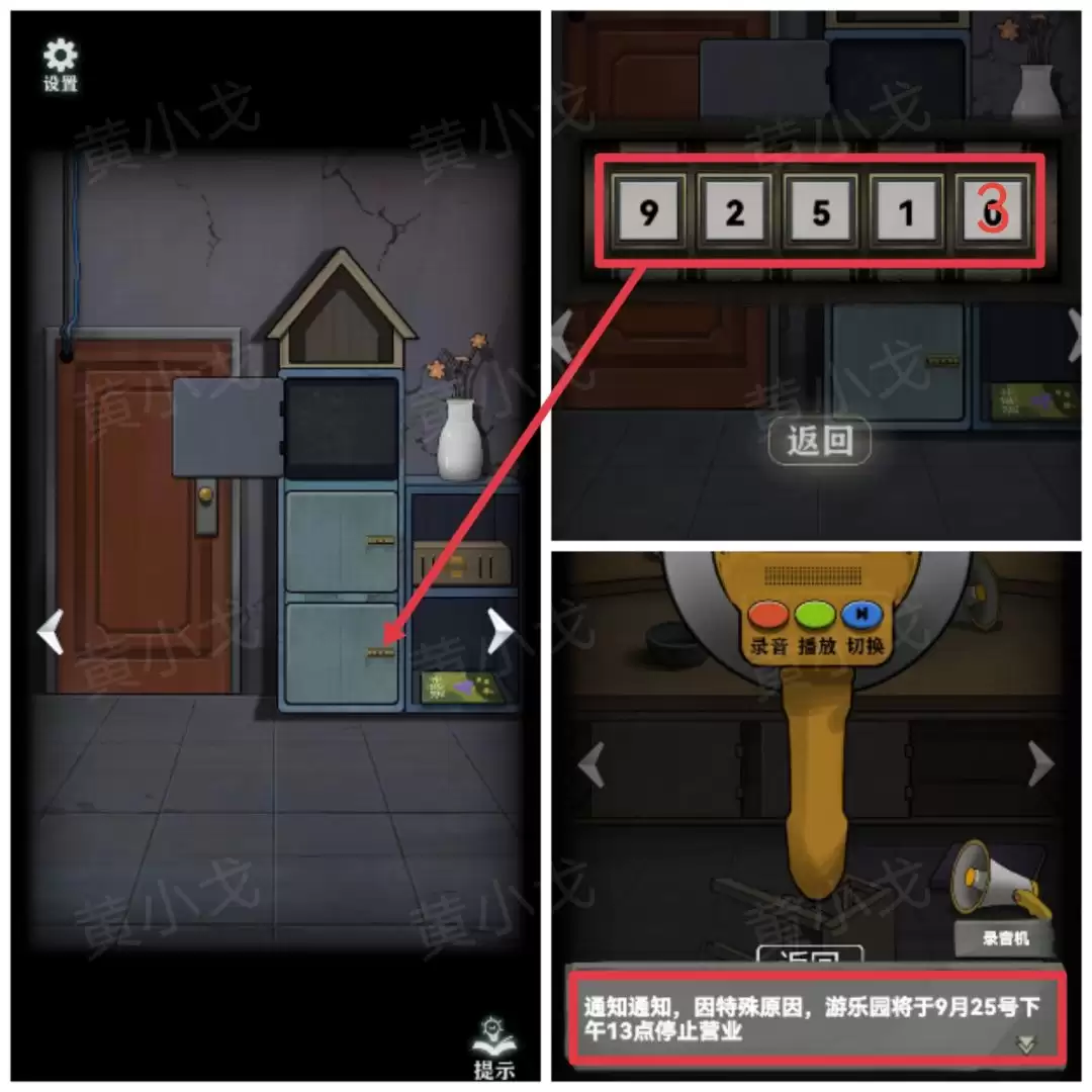 别急,下层还有个密码锁。这次线索来自喇叭的录音:“游乐园于9月25日下午13点停止营业”。提取数字信息,密码就是【92513】。