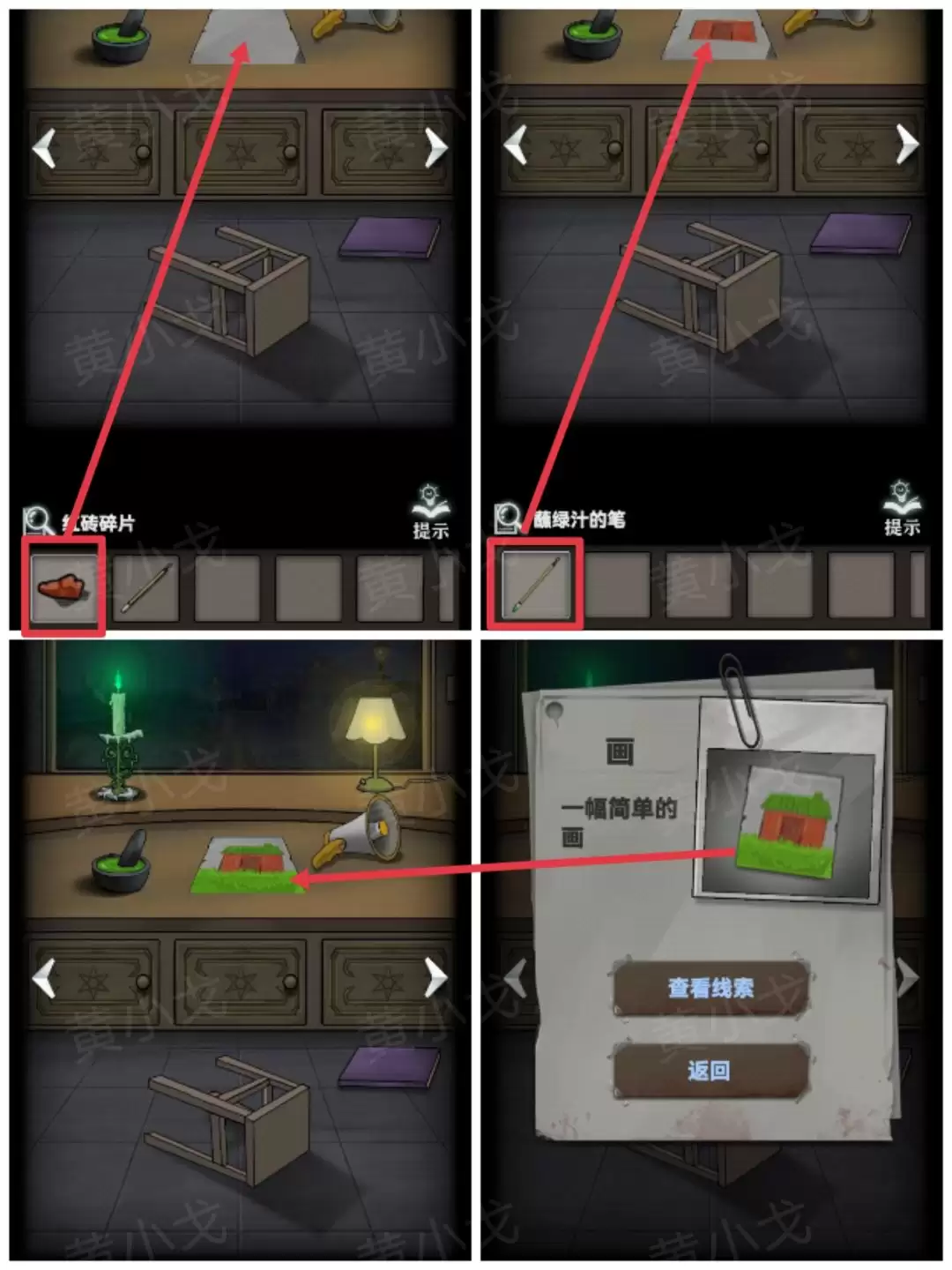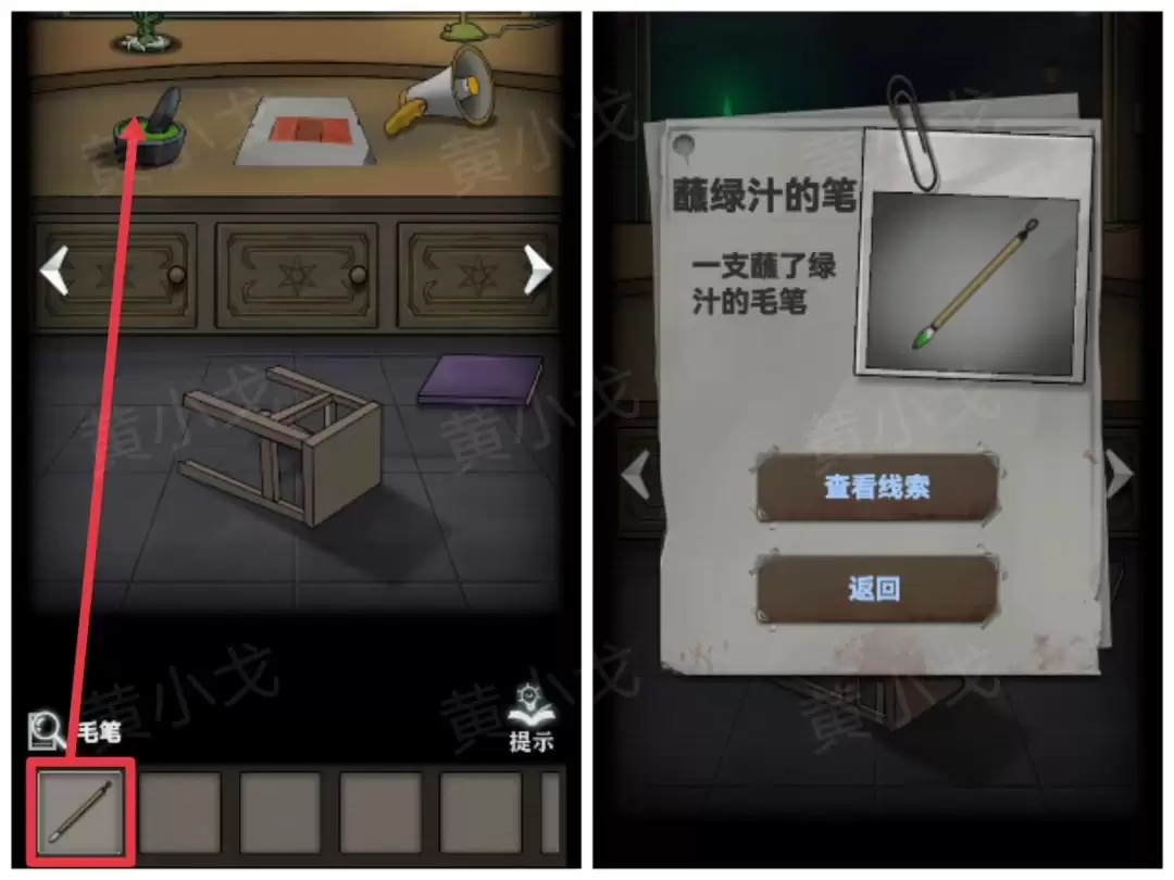 接下来,开始搜刮房间。打开左侧的柜子,你会找到一支【毛笔】。