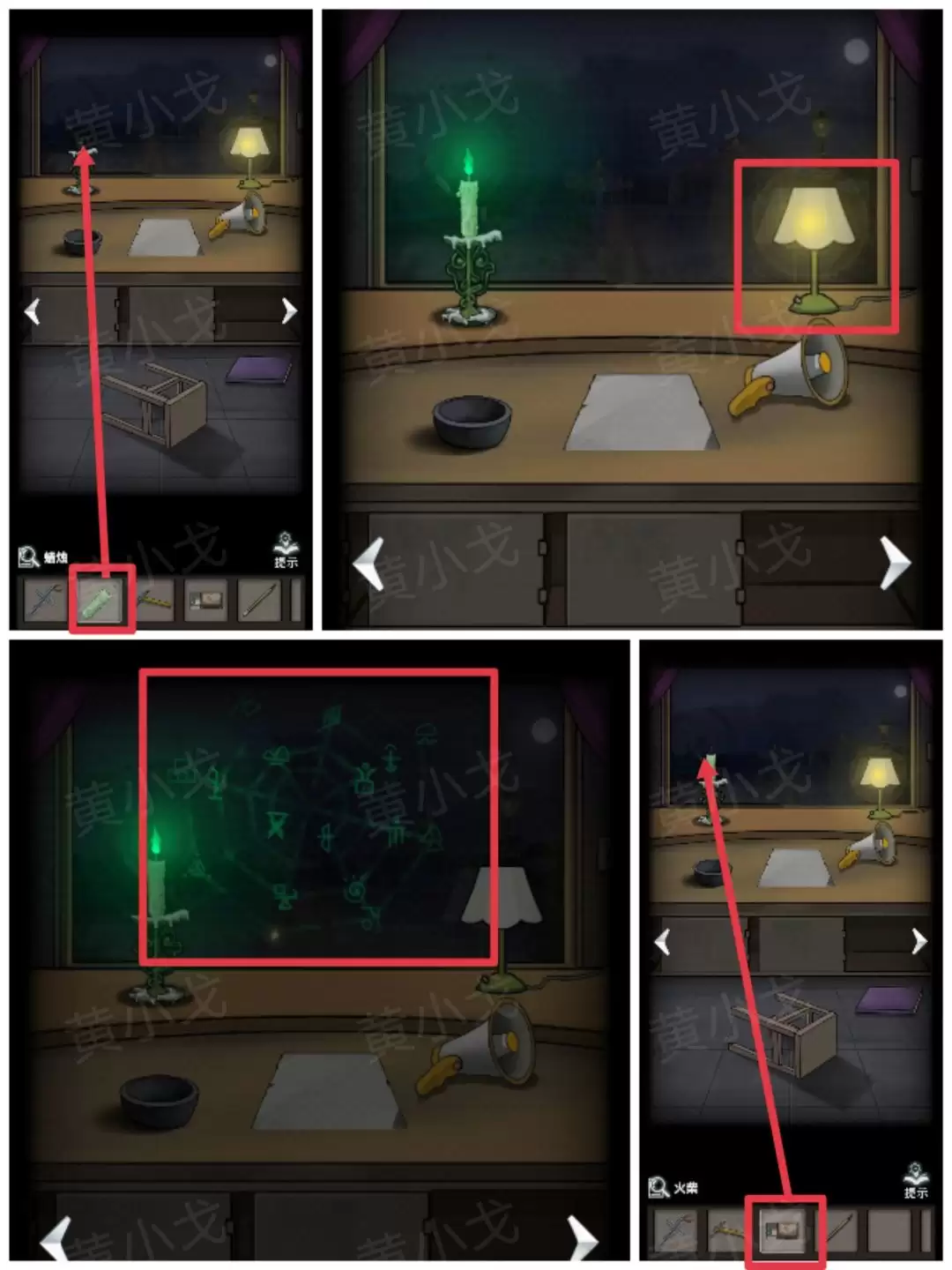 再次来到窗户前。把【蜡烛】放到烛台上,用【火柴】点燃它。然后,关掉台灯。这时,窗户上会浮现出许多符文,务必看清这些符文的排列位置。