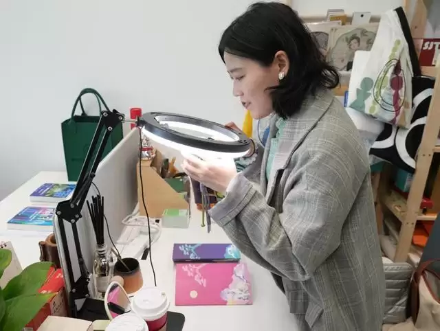 走进静安大宁“视听静界·π空间”OPC创新社区“派客家”的一间办公室,在一排开放式工位中,刘奕秀的角落显得有些拥挤。办公桌上堆叠着金属、亚克力、特种纸等各类样品,身后的架子上错落摆放着数十本材质各异的纸样册,一旁还有她设计的文创成品——一个融合了NFC芯片的亭台式灯座。手机轻触,屏幕里便会播放出一段AI视频。
