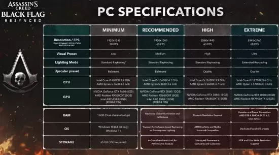 育碧公布了推荐玩家游玩《刺客信条:黑旗 记忆重置》的显卡配置为RTX 4090。