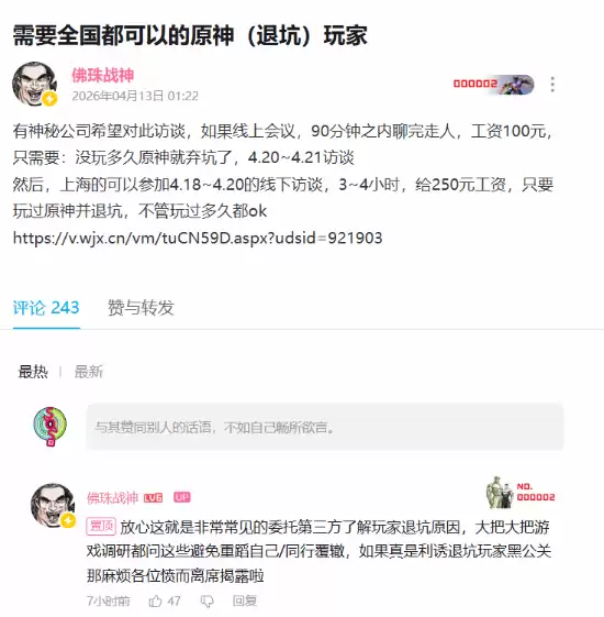B站UP主“佛珠战神”发布《原神》退坑玩家调研招募,高额报酬引发行业关注