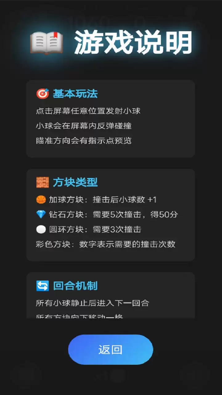 多样方块:游戏里的方块种类丰富,各有各的趣味。撞击「加球方块」能额外获得小球,增加你的火力;「钻石方块」需要撞击5次,击破后直接拿下50分,还有30%的概率掉落钻石,算是惊喜彩蛋;「圆环方块」相对简单,3次撞击即可消除;而「彩色方块」则用数字标明了所需撞击次数,击破就能得分,目标明确。