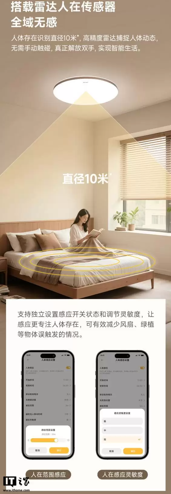 实现“无感唤醒”的核心,是内置的一颗高精度毫米波雷达传感器。相比传统的红外感应,毫米波雷达的穿透力和感知精度更胜一筹,配合AI算法,不仅能捕捉大幅动作,还能识别静止不动的人体状态。其感应直径达到10米,足以覆盖一个标准客厅。这意味着,无论是你深夜起身,还是孩子在房间安静阅读,灯光都能自动响应,人来灯亮,人走灯熄。