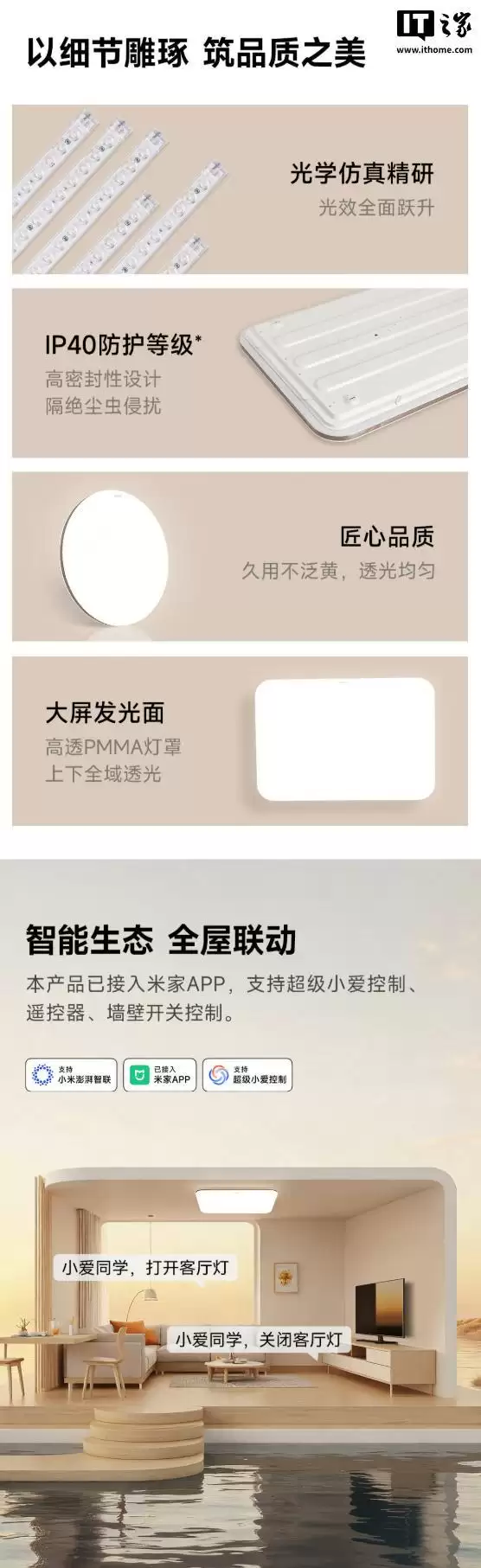 作为智能生态的一员,它的控制方式也足够多元。已接入米家App,意味着可以与其他智能设备联动,设置丰富的自动化场景。同时,它也保留了传统的控制方式,支持超级小爱语音助手、物理遥控器以及墙壁开关控制,兼顾了科技感与全家人的使用习惯。