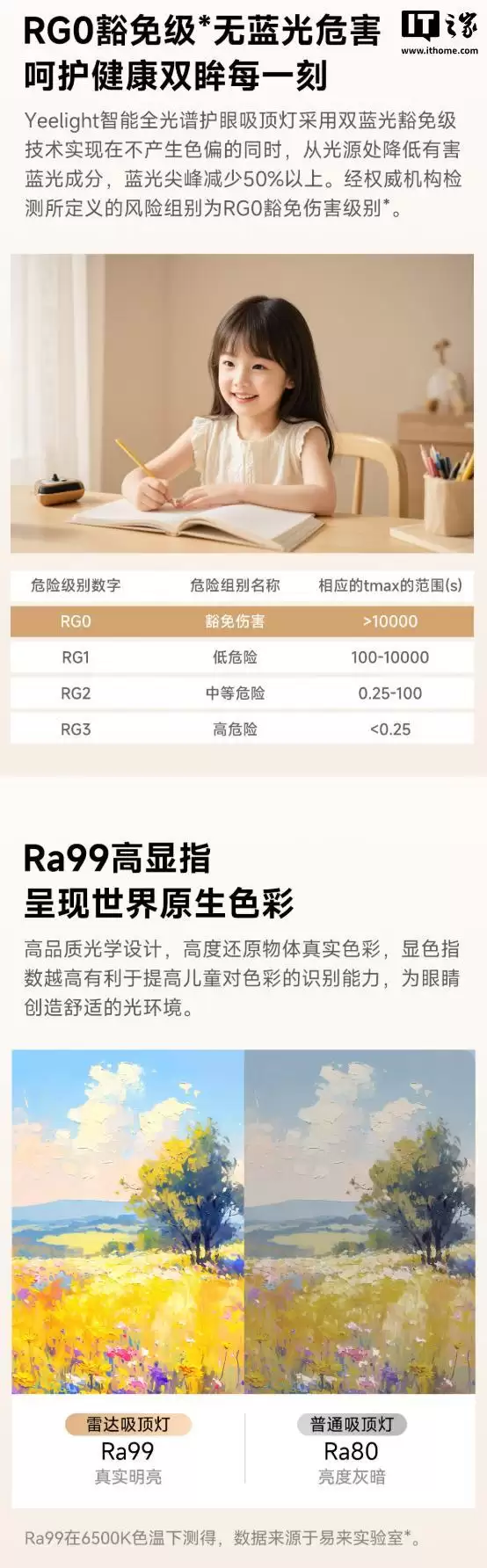 除了智能,护眼是它的另一大主打方向。规格显示,这款吸顶灯采用了双蓝光豁免级技术。简单来说,就是在从光源处降低有害蓝光成分的同时,避免了普通防蓝光灯具容易产生的色偏问题,使得光线依然纯净自然。其显色指数高达Ra99,这意味着在它的灯光下,物体的色彩能得到高度还原,视觉体验更加舒适真实。