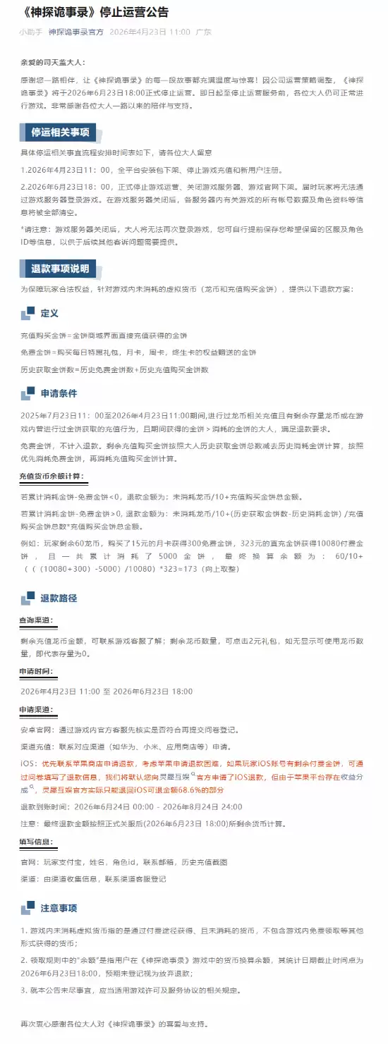 近日,灵犀互娱旗下的一款探案题材手游《神探诡事录》发布公告,宣布将于6月23日正式终止运营。目前,游戏已从各大应用商店下架,一个曾经崭露头角的项目,就此画上句号。