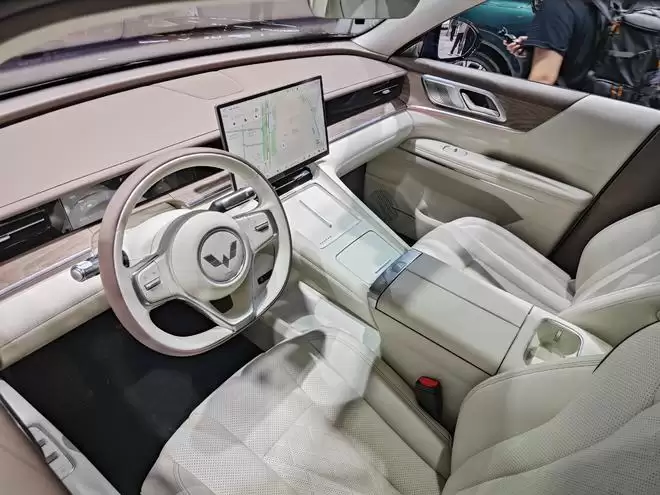 进入车内,砂陶棕与云釉白两种内饰配色,视觉上都营造出温馨舒适的家用氛围。但五菱显然想表达更多:方向盘的设计融入了书法墨韵的灵感;木纹饰板通过镭雕擦色工艺,还原了原木的真实触感;真金属扬声器罩的打孔图案,暗合着古典音乐的韵律;甚至空调出风口的奈落孔格纹,都运用了传统的方胜纹样。功能层面,前排是8.8英寸液晶仪表与15.6英寸中控屏的组合,屏幕下方设有手机无线充电面板。256色氛围灯可以随心调节氛围,而副驾座椅集成的老板键和后排小桌板,则是对全车乘客体贴入微的考量。