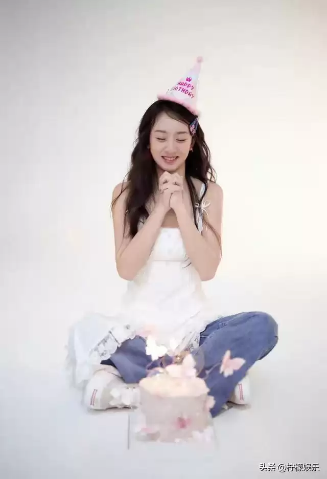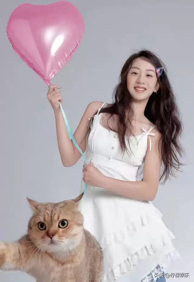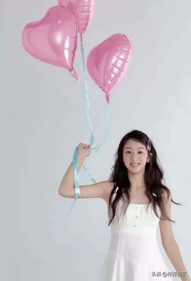 生日照片中的Cindy,一袭白色连衣裙搭配简约牛仔裤,手牵粉色爱心气球,长发披肩,气质已然出落得亭亭玉立。