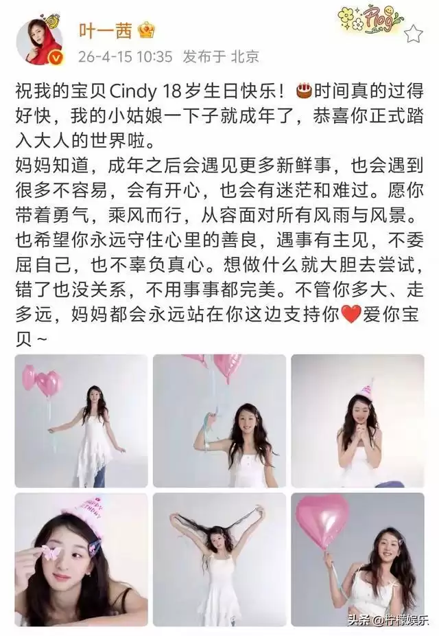 叶一茜写道:“时间真的过得好快,我的小姑娘一下子就成年了。恭喜你正式踏入大人的世界,愿你带着勇气,乘风而行,永远守住心里的善良,遇事有主见,不委屈自己,也不辜负真心。”