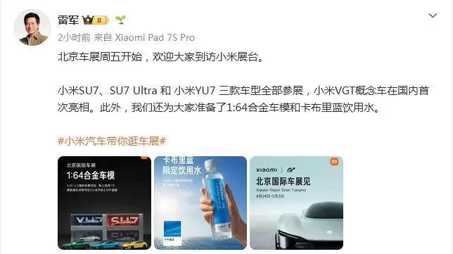 雷军官宣2026北京车展小米汽车参展阵容 概念车国内首秀 现场还能领车模与饮用水