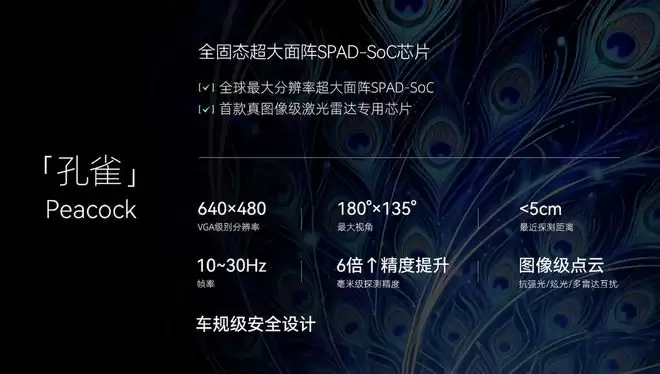 再看“孔雀”芯片,它的优势在于近距离、广视场和全固态。其最大视场角可达180°×135°,最近探测距离小于5厘米,支持10至30Hz的帧率。更值得一提的是,其在测距精度上较上一代产品提升了6倍,达到了毫米级水平。