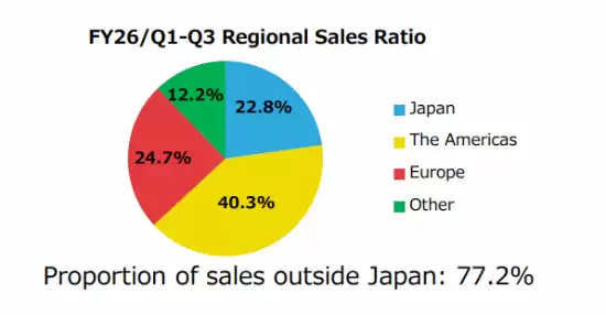 具体数据最能说明问题。美洲市场以40.3%的营收占比,牢牢占据任天堂全球最大收入来源的地位。欧洲市场以24.7%的份额位列第二,而作为公司发源地的日本本土市场,贡献占比为22.8%。其他地区合计贡献了12.2%。通过计算可知,任天堂高达77.2%的销售收入来源于海外市场,本土贡献已降至不足四分之一。这不仅是营收结构的变化,更是其全球化战略取得实质性成效的有力证明。