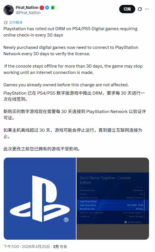 简单来说,以后新购买的数字游戏,可能得养成一个“签到”习惯了:每30天,你的主机需要连接一次PlayStation网络,让系统确认一下你的游戏授权依然有效。