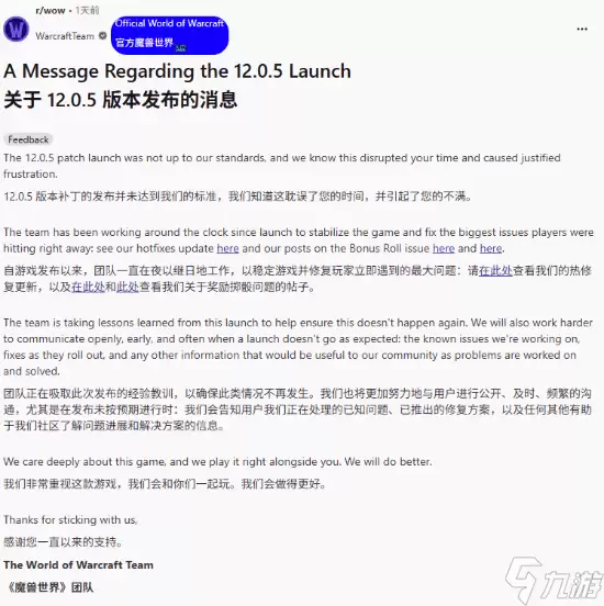 《魔兽世界》更新翻车 暴雪官方紧急致歉