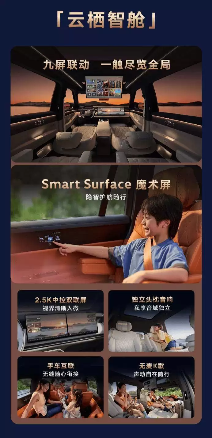 但更值得细品的是它的座椅系统。前排的“女王座椅”与第二排的行政级座椅形成了组合拳,而首发的动态零重力座椅更是亮点,其内置的12L大容量坐垫气囊,旨在提供一种接近零重力的漂浮感。这种六座布局,既考虑了多孩家庭的出行场景,也没有忽略商务接待的舒适需求,意图两手抓。