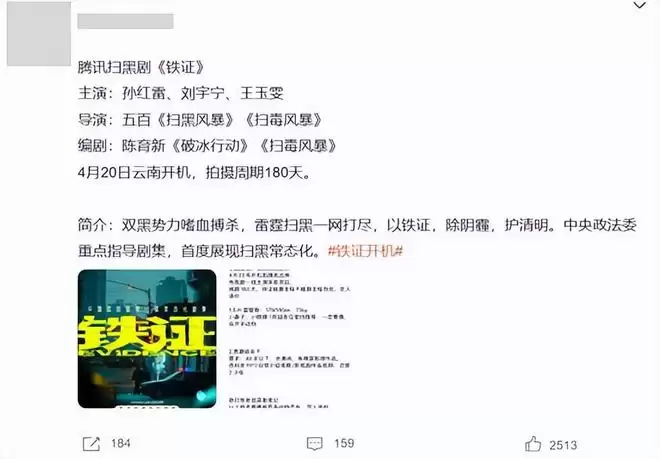 最新网络信息显示,由五百执导、陈育新编剧的扫黑题材新剧《铁证》即将开机。