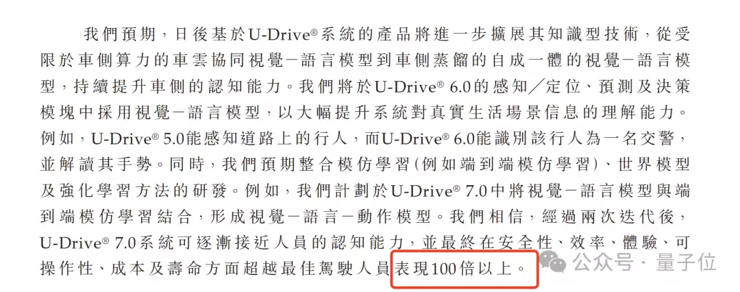 招股书里有一段话很有意思,提到他们规划到U-Drive® 7.0系统时,可以逐渐接近人员的认知能力,并最终在安全性、效率、体验、可操作性、成本及寿命方面超越最佳驾驶人员表现100倍以上。