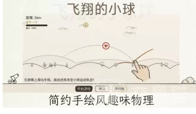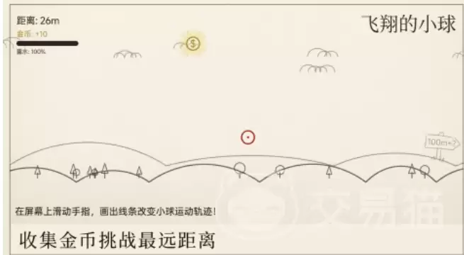 本作采用了极简主义的手绘美术风格,线条柔和,配色舒缓,界面没有任何冗余元素,视觉上自带一种天然的放松感。它的核心玩法围绕“大炮发射+轨迹引导”展开:玩家只需用手指在屏幕上绘制飞行路径,就能控制小球的运动方向与力度。目标很简单,就是让小球飞得更远,同时收集沿途的金币,逐步解锁新的场景、道具以及更多趣味机制。