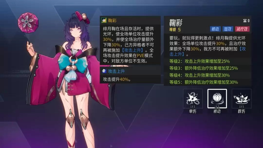 这是她的核心技能,提供一个全场光环:提升全体攻击,并降低受到的治疗效果30%。但有个限制:友方无法再被附加其他攻击上升效果。需要特别注意,这个全场加攻效果在PVE环境中是不会触发的。毫无疑问,这个被动技能推荐优先点满。