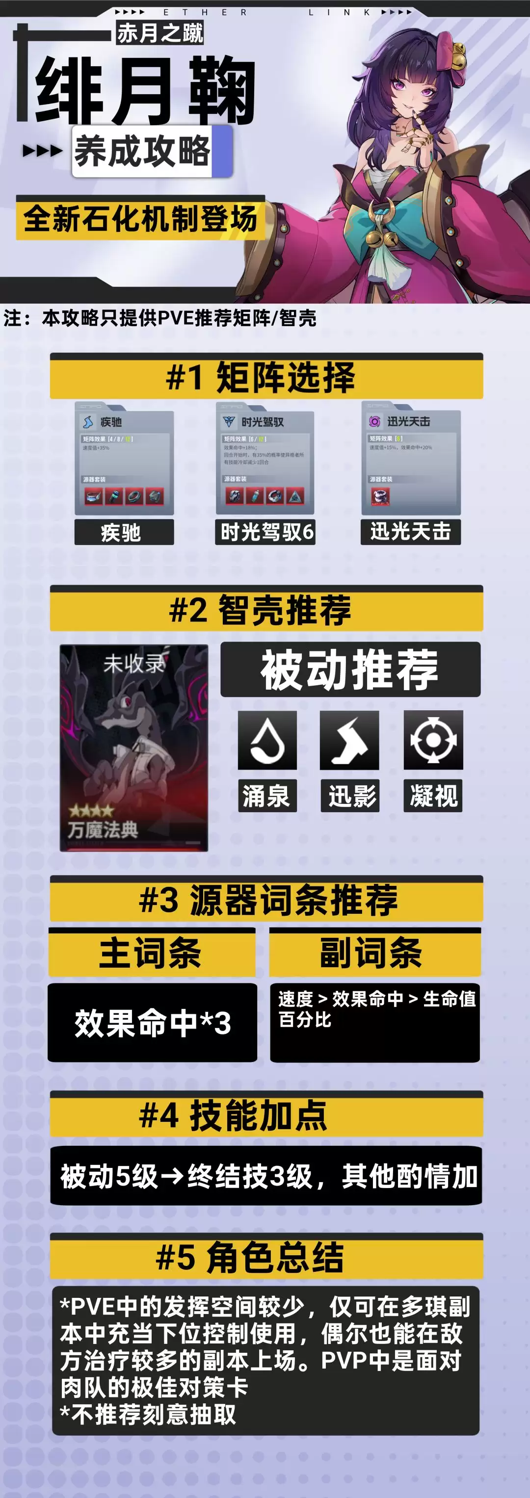绯月鞠的战术核心在于先手控制,所以速度是关键。一号位矩阵毫无争议,选择【疾驰】来保证出手顺位。由于终结技的石化基础概率不算高,二号位在PVE环境下,仅推荐【时光驾驭6】,用来补充效果命中,避免控制落空的尴尬。在PVP中,则可以考虑携带【奋进】来争取多次出手机会,或者用【荆棘】进行反击推条。三号位优先选择【迅光天击】,它能同时满足对速度和效果命中的双重需求;次选是【疾影强袭】,进一步提升速度。