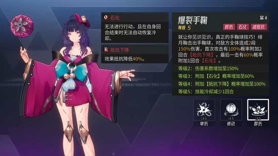 对敌方全体造成两段伤害。首次攻击会附加“抵抗下降”效果,最后一击则有60%的基础概率附加持续一回合的“石化”。被石化的目标不仅无法行动,在回合结束时还无法减少技能冷却时间。这个终结技是绯月鞠的主要控制手段,推荐至少升到3级,以稳定附加石化状态。