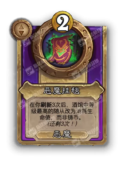 恶魔挂毯的核心效果设计得非常巧妙:当你累计刷新酒馆3次后,当前酒馆中等级最高的那个随从,其购买方式将发生根本性改变——它不再消耗你的铸币,而是改为直接消耗你的英雄生命值。