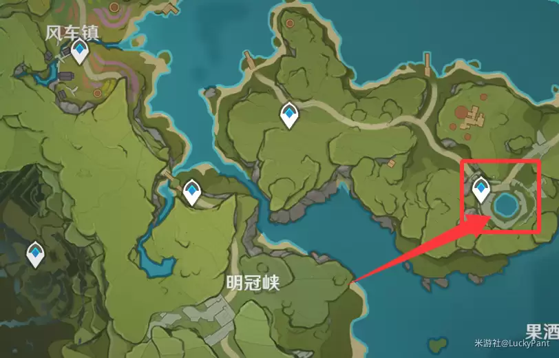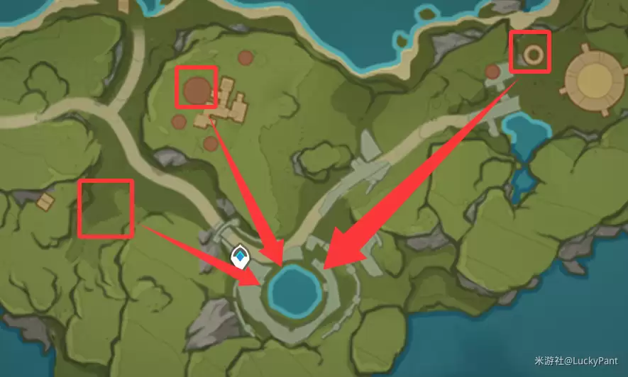 你需要前往下图标记的3个位置。这三个点各有一个等待“回家”的仙灵。我们的任务就是护送它们,或者更直接点,触碰它们,引导它们回到各自的基座。