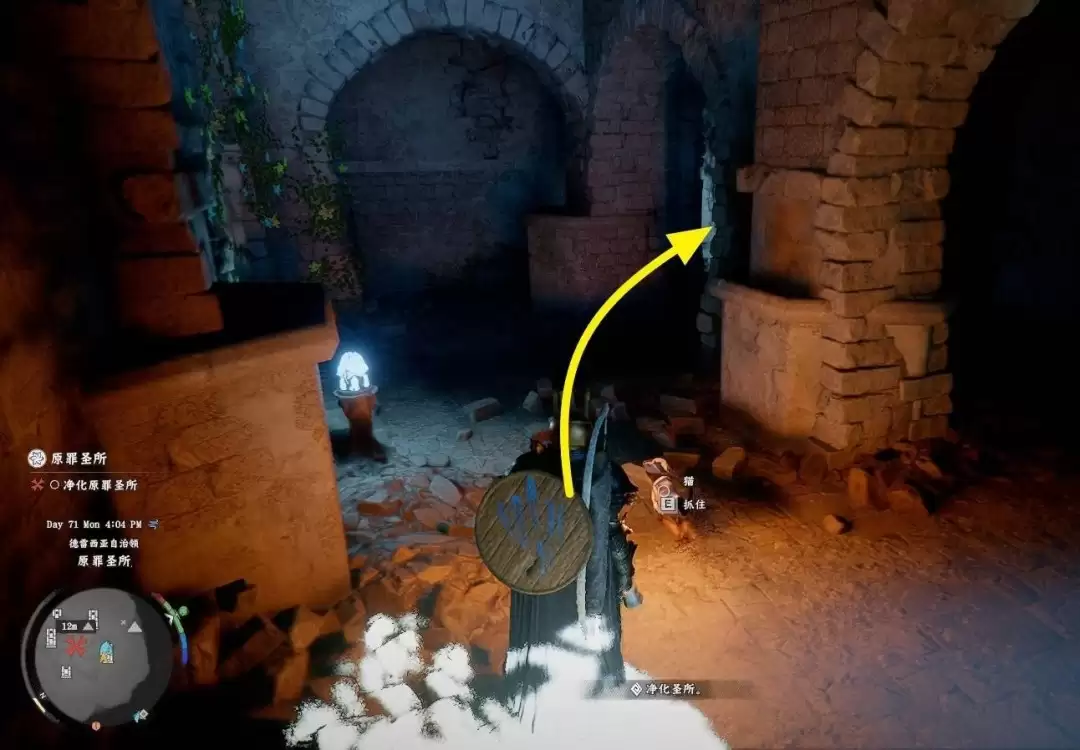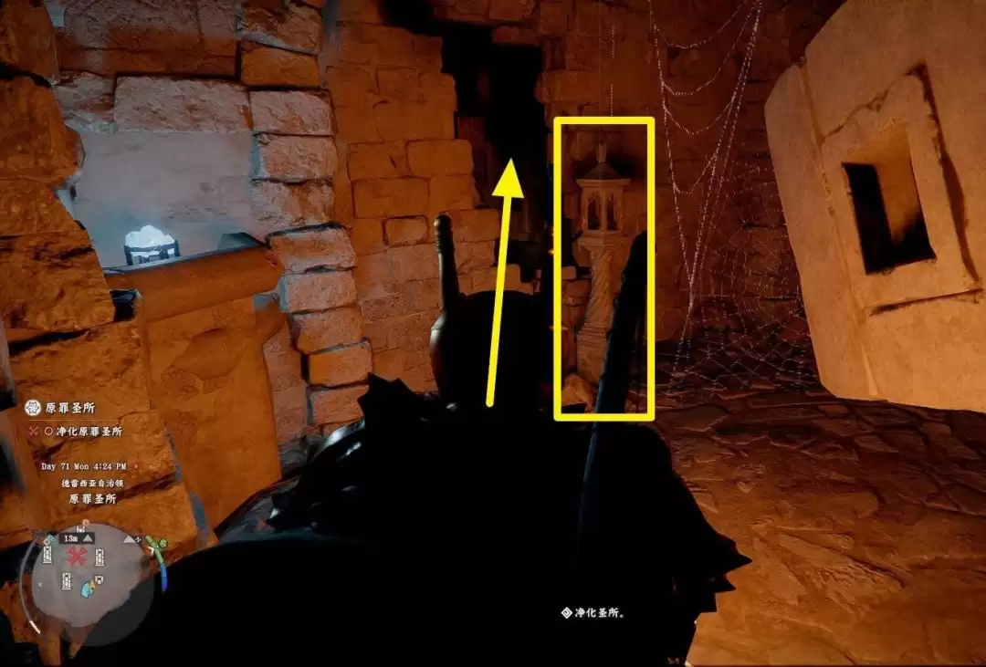 到达下层后,场景较为开阔。您首先会看到“净化圣所”任务相关的任务道具——一个方块。而我们的目标,那个用于解除机关的石灯笼,就在这个方块的旁边。上前互动将其点亮,即可使入口房间的尖刺陷阱失效。