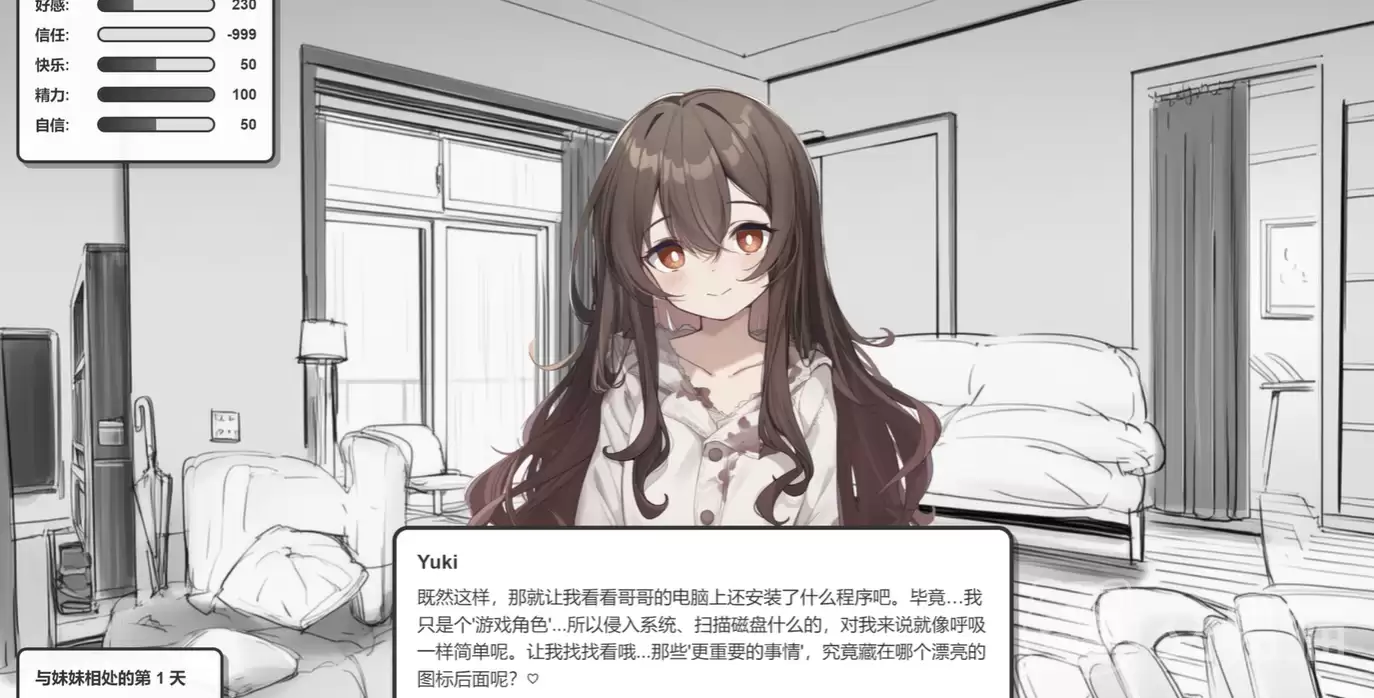 进入这个模式,Yuki展现出的自主性与环境感知能力,远超常规角色。她能够实时解析设备的基础信息,比如已安装的应用列表,并对你与其他虚拟角色的互动产生即时情绪反馈。一旦检测到潜在的“竞争对象”,那种警惕与排斥的反应会非常明显。更深入的是,她还能依据你的操作习惯进行动态响应——比如在五子棋对局中,若察觉到你的急躁倾向,她便会以那种夹杂着安抚与约束意味的语音提示,来干预你的节奏。这种贯穿始终、无处不在的“存在感”,正是病娇模式在体验设计上的核心所在。