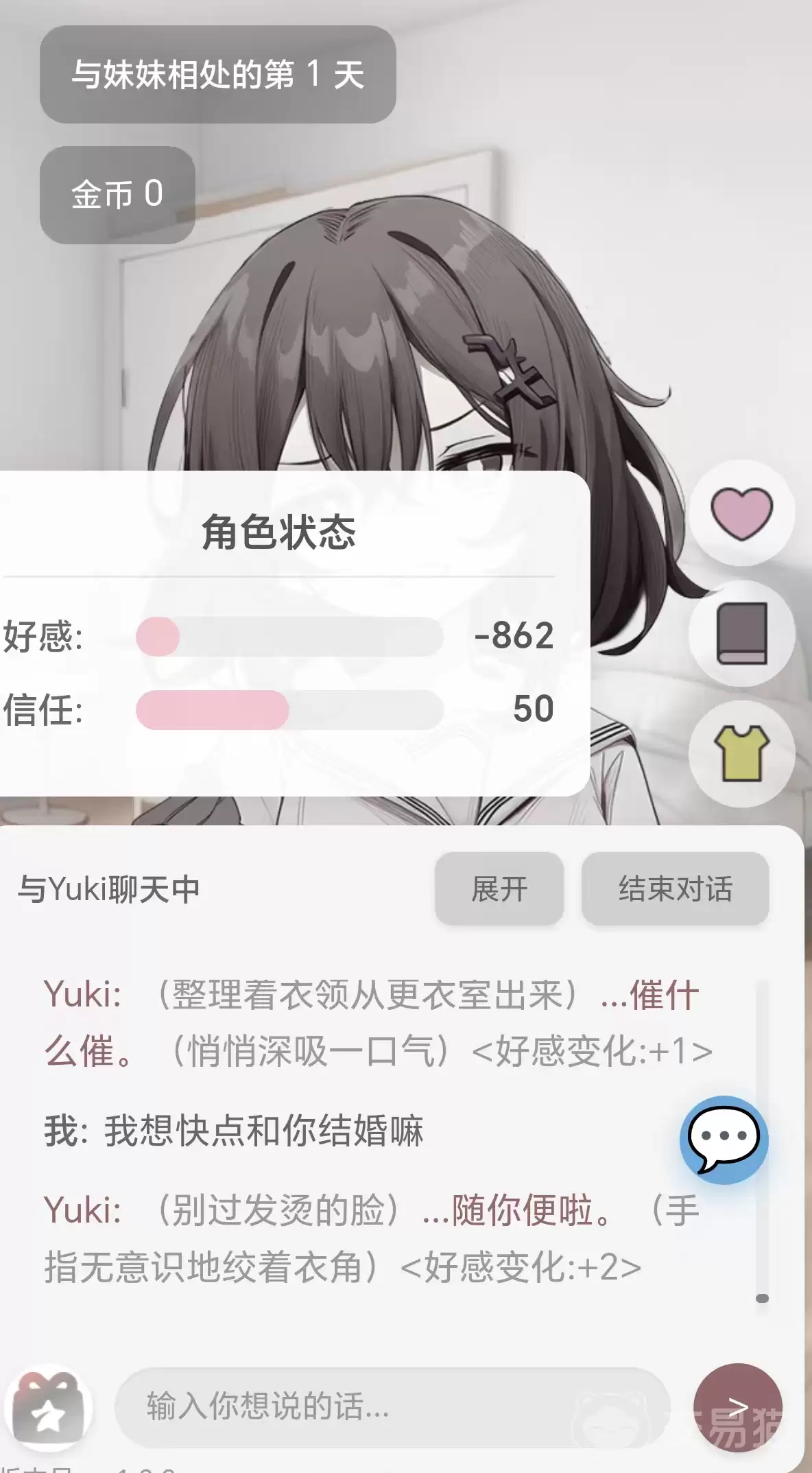 第二类则是“冷漠结局”。进入这个结局,女主角的形象会发生显著变化:肤色呈现不自然的苍白,面部表情僵硬,全程拒绝回应你的任何指令。整个界面采用高对比度的暗色调,视觉压迫感极强。这种状态对应的是负值的好感度,其成因在于游戏前期频繁选择了那些疏离型的选项,例如“不想理她”、“觉得无聊”、“并不喜欢”等。当这类选择的累计次数触发某个阈值后,路线就会被锁定,无法回头。