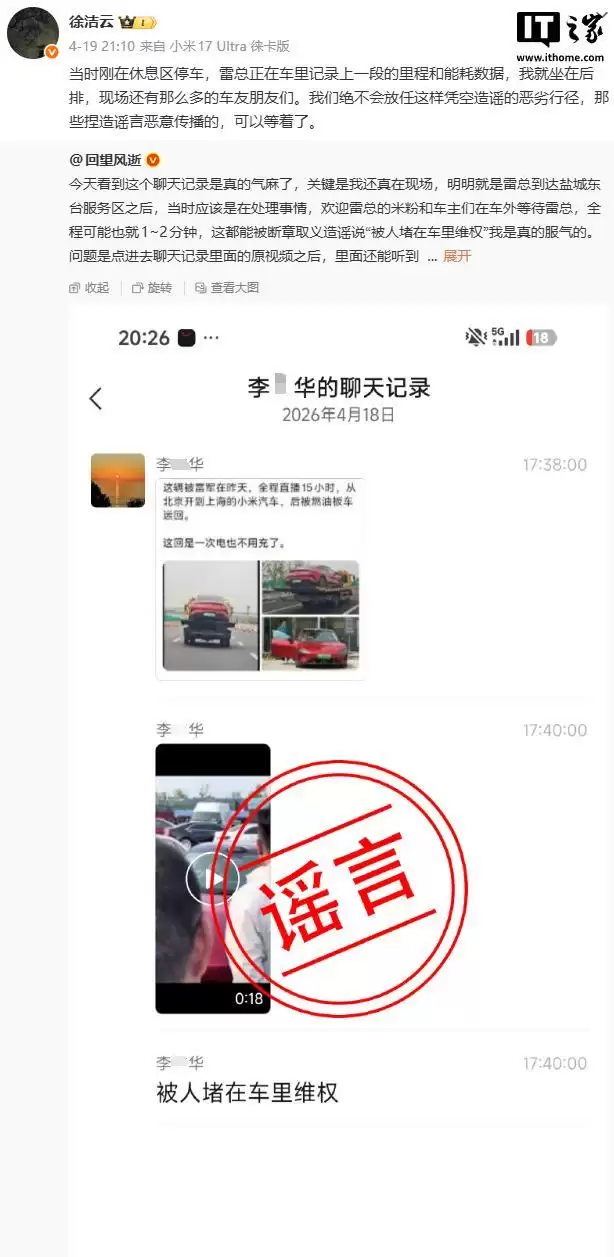 这并非小米近期首次对网络不实信息采取行动。就在一周前的4月19日,小米集团董事长特别助理、战略市场部副总经理徐洁云已在微博上,就另一则广为流传的“雷军被人堵在车里维权”的传闻进行了公开澄清。