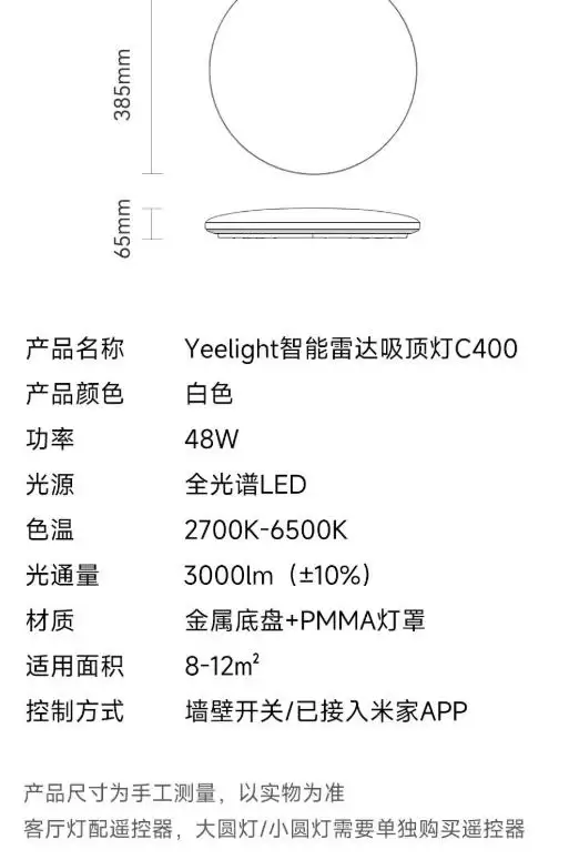 最后,附上这款Yeelight智能雷达人在护眼吸顶灯RadarSense的详细规格参数,供您参考: